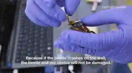研究人员使用了一种大型的花甲虫(乌干达角金龟)作为实验对象,它具有敏捷的飞行能力,坚固的硬壳可保护自己免受碰撞,也能承受“电子背包”的负载。