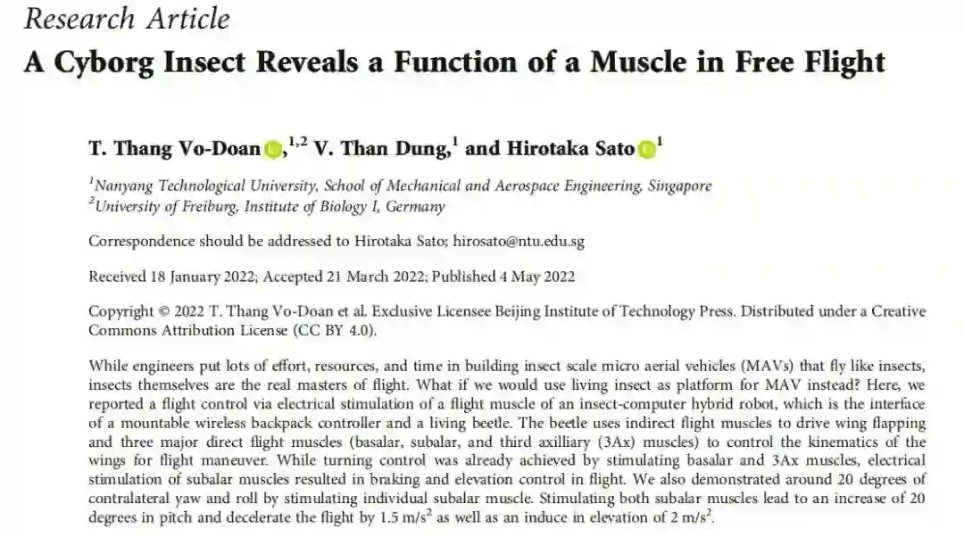 这项研究的标题为《A Cyborg Insect Reveals a Function of a Muscle in Free Flight》,发表在由北京理工大学主办的Cyborg and Bionic Systems(类生命系统)期刊中。