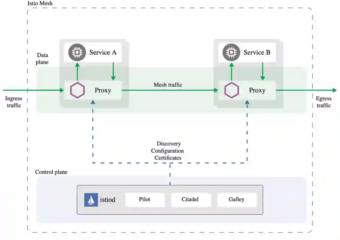 下面的图表摘自 Istio 体系结构文档,尽管提到的技术是特定于 Istio 的,但组件对于所有服务网格实现都是通用的。