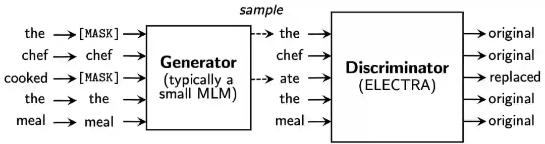 举一个例子:the chef cooked the meal(主厨烹饪了一餐饭)这个原句,经过 mask 和 generate 后,cooked 被替换为 ate,即“主厨吃了一餐饭”。虽然这个替换本身没有语法错误,但是从语境上判断,cooked 显然要和 chef 这个词关系更紧密,更符合语境。我们的目标,就是希望判别器也能学习到这些句子、乃至段落层面的语境理解,从而判断出 ate 是不恰当的替换。