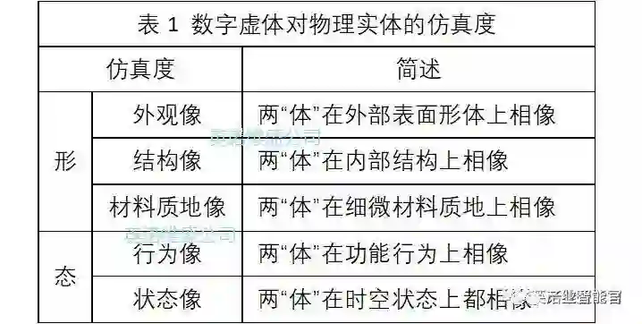 应该说,数字孪生是建设CPS的基础,是CPS发展的必经阶段。所谓建立数字孪生关系,就是以“软件定义”的方式,对物理实体(物理孪生体)建立了完全对应的数字虚体(数字孪生体),所创建的数字虚体经历了一个从其“形”、其“态”,逐渐向物理实体的“形、态”逼近的过程,直至看起来完全“相像”,如同同胞兄弟一般。在“相像”程度上,可以用不同级别的仿真度来衡量,如表1所示。