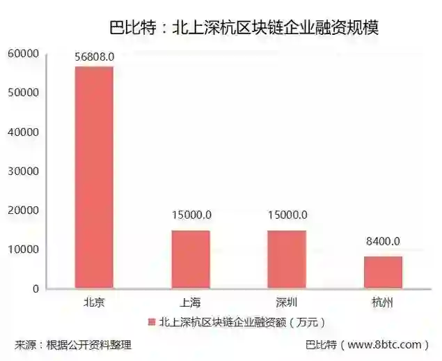 从融资规模看,北京12家区块链公司累计获得融资额达到56808万元,上海两家区块链公司共计获得15000万元融资,深圳1家区块链公司获得15000万元融资,杭州6家区块链公司获得8400万元融资。所以从融资规模的角度看,北京再次以压倒性优势占据四城之首。