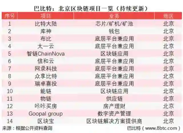 尽管北京迄今尚未出台针对区块链产业发展的专项政策,但是并不妨碍北京本地区块链技术的发展,据《乌镇智库》统计,北京目前是全国从事区块链技术创业公司最多的地方,超过40家,占全国总数的40%以上。代表性公司有驰名中外的芯片研发和比特币矿机销售厂商——比特大陆,曾经世界排名前三的比特币交易所——火币、OKCoin(二者因政策原因,目前被关闭)。
