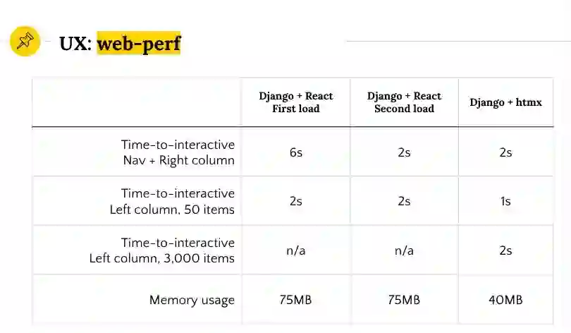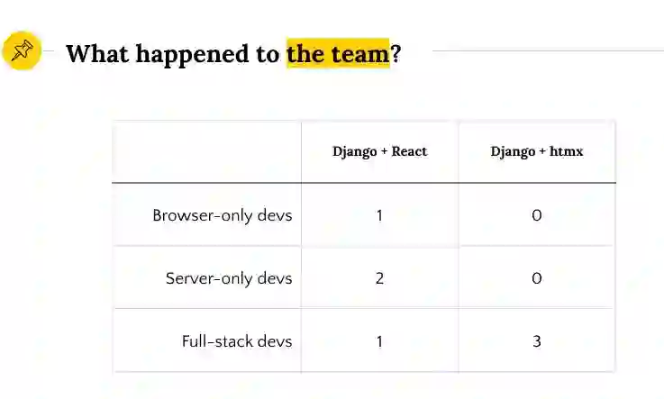 而在移植至 htmx 之后,整个团队全都成了“全栈”开发人员。于是每位团队成员都更高效,能够贡献出更多价值。这也让开发变得更有乐趣,因为开发人员自己就能掌握完整功能。最后,转向 htmx 也让软件优化度上了一个台阶,现在开发人员可以在栈内的任意位置进行优化,无需与其他开发者提前协调。