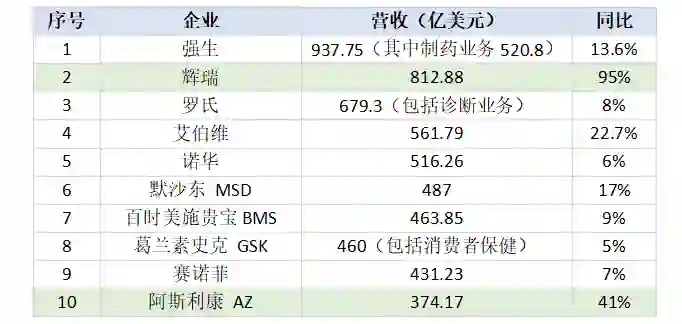 如业界预测的一样,2021年,辉瑞凭借其在新冠疫苗上的突出表现,以812.88亿美元的营收、95%的同比增长再次登顶。阿斯利康则以374.17亿美元、41%的同比增长排名第十。不得不提及的是,截至目前,阿斯利康已向180多个国家和地区发放了26亿多剂的COVID-19疫苗,其中约三分之二供应给中低收入国家。
