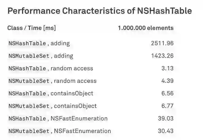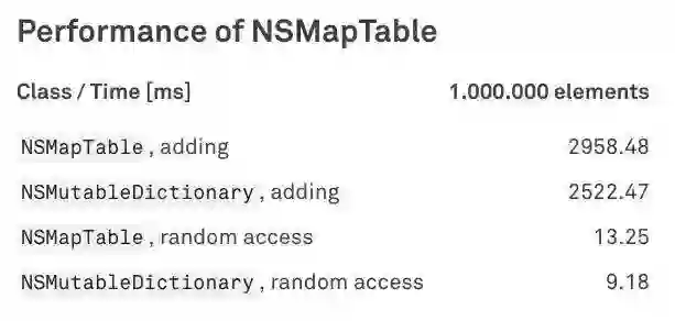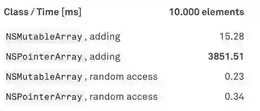 这个方案应该是最简单的了,毕竟是苹果Foundation框架里封装的高级对象。但是其缺点是性能相比对应强引用容器在性能上有所欠缺,根据Objc.io文章中的测试结果,NSHashTable的addObject和NSPointerArray的addPointer性能差距尤其严重,使用时需要注意。