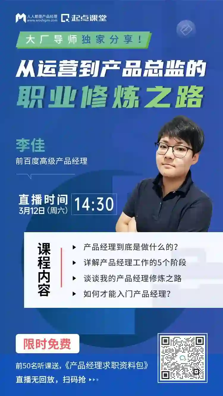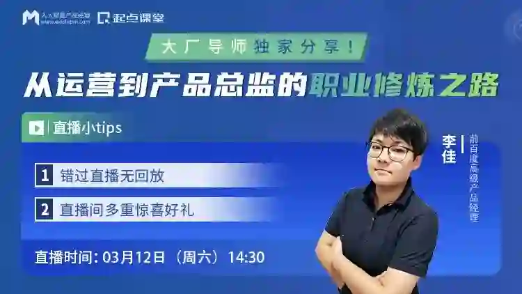 基于此,3月12日(周六)14:30-15:30,人人都是产品经理社区&起点课堂特邀前百度产品经理、前老饭骨产品总监@李佳,来为大家分享多年职业经验沉淀与入门指南。