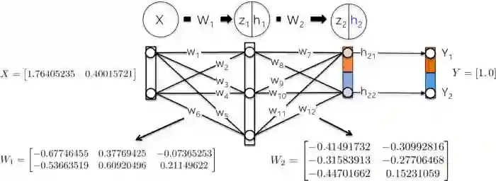 这一步的目标就是把输入变量 X 向前传递到网络的每一层,直至计算出输出层 h_2 的向量。