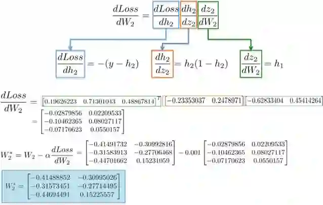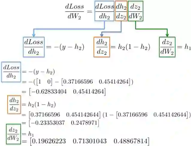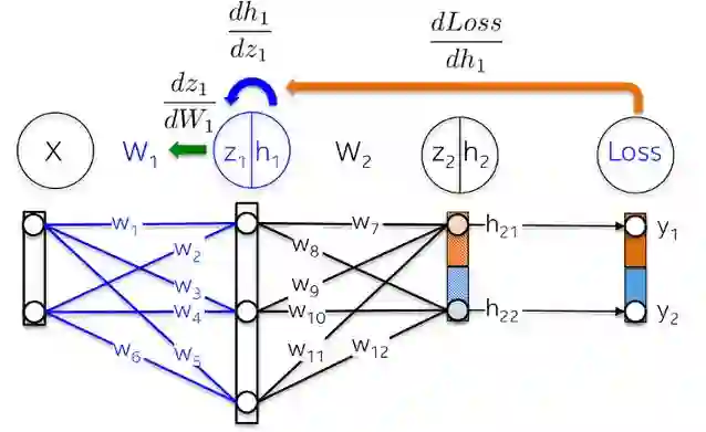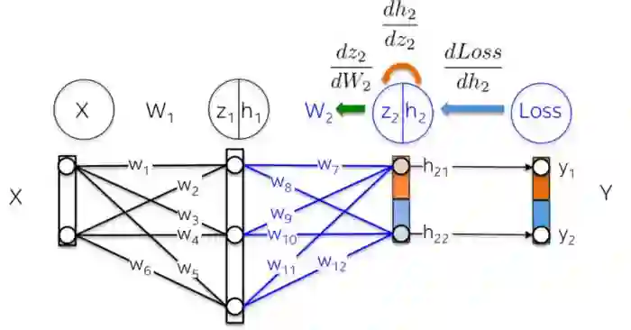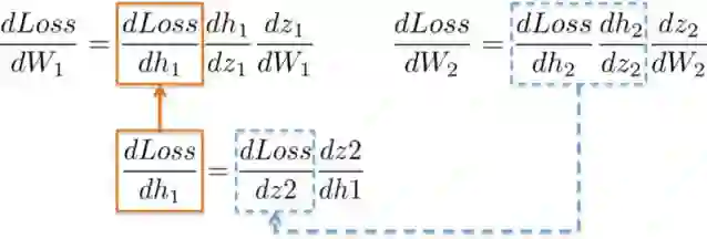 例如,偏导数 dLoss/dh_2 和 dh_2/dz_2 在上一节中已经被计算为输出层 dLoss/dW_2 学习权值的依赖项。