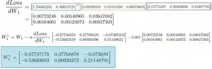 结果是一个 3x2 的矩阵 dLoss/dW_2,它将会沿着最小化损失函数的方向更新 W_2 的数值。