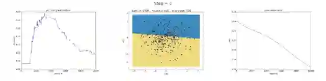 首先,我们来看一下隐藏层具有 3 个神经元的神经网络为何能力较弱。这个模型学会了用一个简单的决策边界来进行二分类,这个边界开始是一条直线,但是随后就表现出了非线性的行为。随着训练的持续,右图中的损失函数也明显地减小。