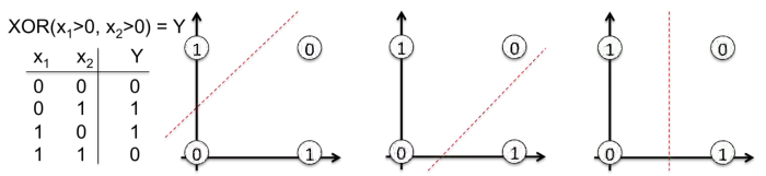 为了描述这个重要的概念,请注意下图中,一条直线是为何不能对异或函数输出中的 0 和 1 进行分类。现实生活中的问题也是非线性可分的。