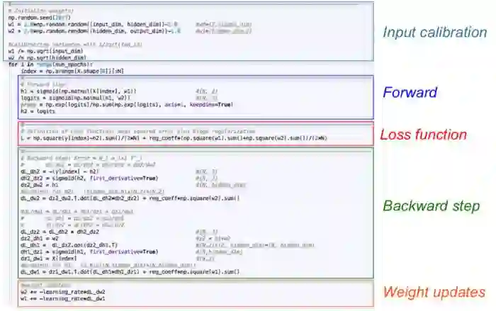 让我们仅使用 numpy 作为线性代数引擎来将上面的数学方程转换成代码。神经网络在一个循环中进行训练,其中每次迭代会给神经网络展示标准的输入数据。在这个小例子中,我们只考虑每次迭代中的整个数据集。前向步骤、损失函数和反向步骤的计算会得到比较好的泛化,因为我们在每一次循环中都用它们对应的梯度(矩阵 dL_dw1 和 dL_dw2)来更新可训练的参数。