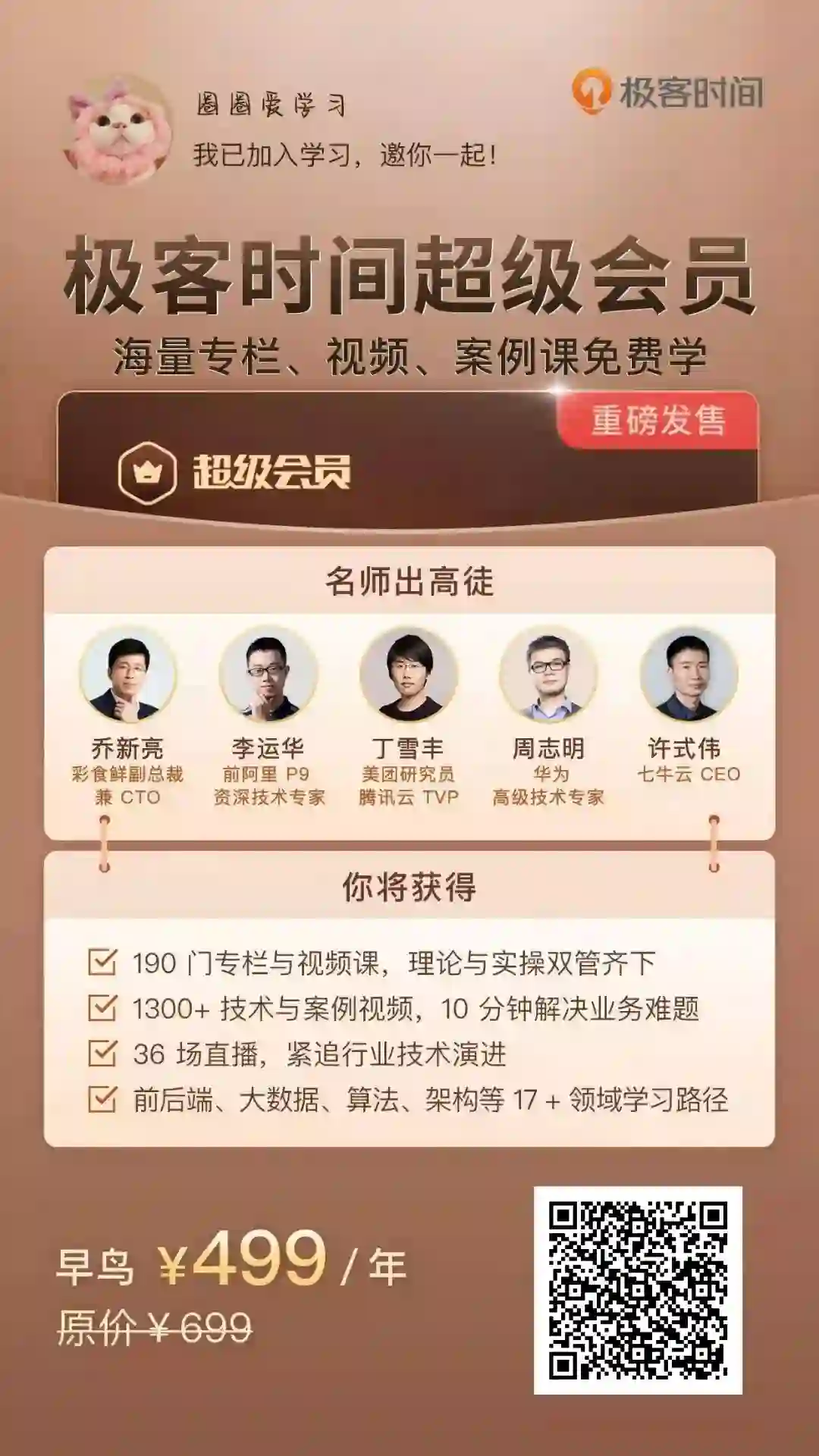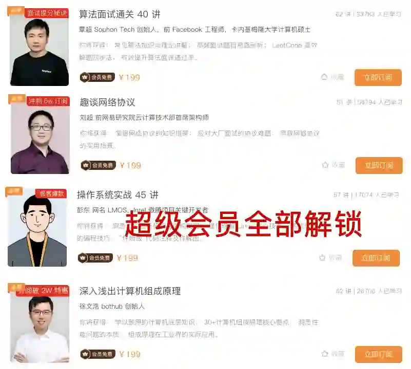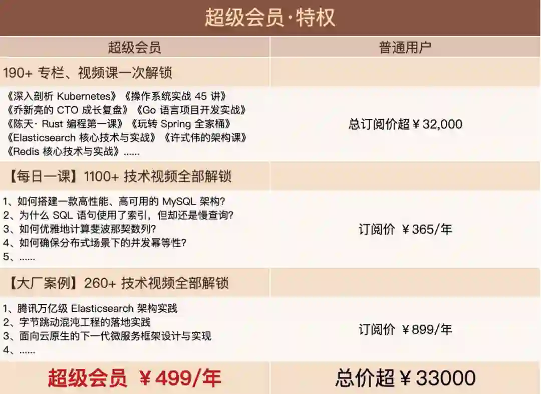 结果今天极客时间的运营小姐姐还真找到我,说:极客时间推出了超级会员,499/年,一次性解锁 196 个专栏、1100+每日一课视频,以及 260+ 大厂案例视频。更重要的是,未来上新的所有专栏、视频课,只要带有会员免费标识,都可以直接看。