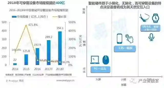 Analysys易观估算,2018年可穿戴设备市场规模将接近400亿元,其中品类最大的是智能手表。近两年,VR,AR的概念开始深入大众,未来几年相关硬件将呈现爆发式增长。而可穿戴设备由于其特性所限,很难通过单一触摸实现流畅交互,因此语音交互成为刚需。