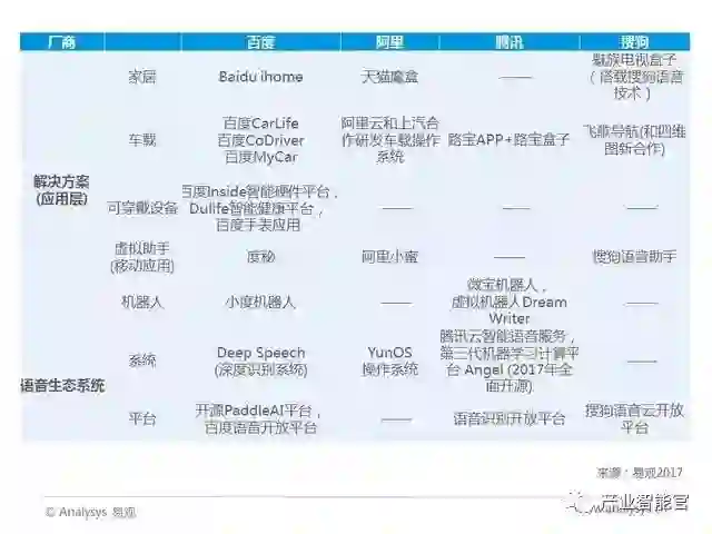 在中国,以BAT等为代表的众多互联网巨头也纷纷开发智能语音市场。在语音生态系统方面,百度宣布语音识别技术及能力全面开放。腾讯、搜狗语音开放平台相继上线。