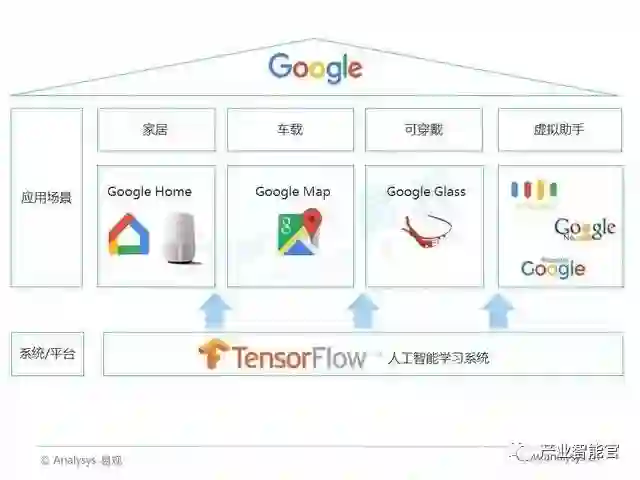 在谷歌的AI first战略中,一方面,推出人工智能学习系统平台TensorFlow,以吸引开发者,实现产品快速迭代,打造开发者生态链,形成行业标准;另一方面,推出谷歌家庭,试图建立物联网时代安卓系统。同时,将AI技术应用于其原有的产品中,比如Google输入法、Google 翻译、Google Now等,不断提升产品性能,优化用户体验。