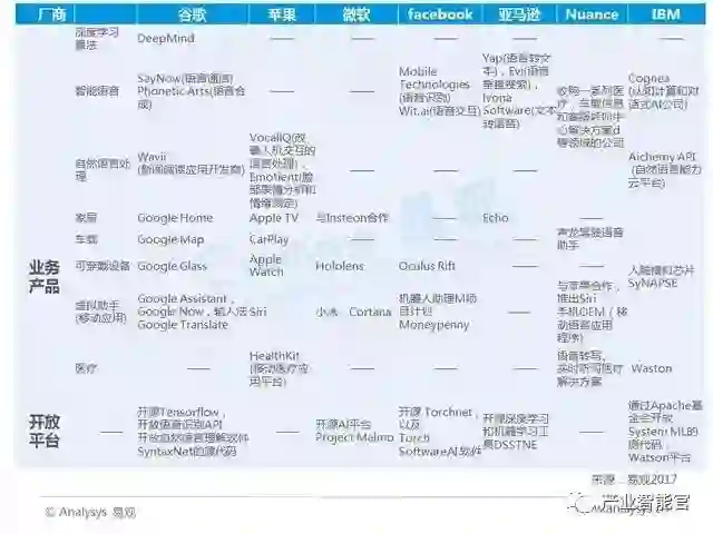最上层是行业应用。大致分为2B和2C两个方向。2B的代表领域包括安防、金融、医疗、教育、呼叫中心等。2C的代表领域包括智能家居、可穿戴设备、无人驾驶、虚拟助理、家庭机器人等。相关代表性企业既包括互联网科技巨头,也包括一些初创厂商。