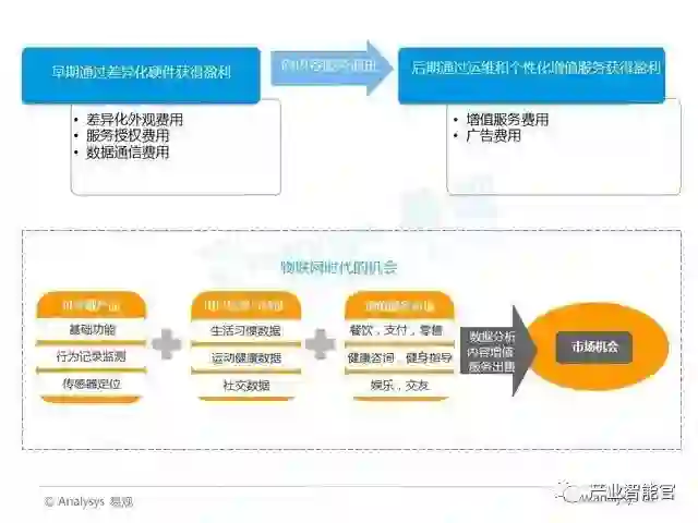 Analysys易观分析认为,可穿戴设备的发展仍旧遵循从早期的差异化硬件盈利,过渡到后期的运维和个性化增值服务盈利的模式。可穿戴设备是用户使用时间最长的智能硬件设备,会收集到用户属性、生活习惯、行为轨迹、运动健康以及社交等方面的数据。
