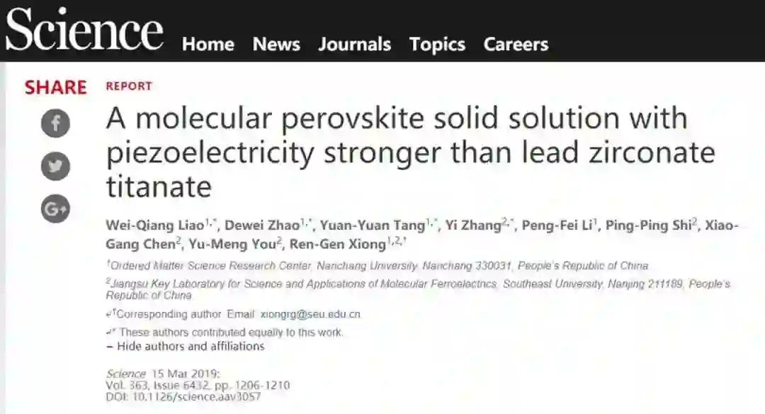 2019年,南昌大学熊仁根教授领衔的研究团队在分子铁电研究领域取得新进展,3篇论文发表于Journal of the American Chemical Society(JACS,影响因子14.357,一区TOP期刊),1篇发表与Advanced Materials(AM,影响因子21.950,一区TOP期刊),1篇发表在PNAS(影响因子9.504)。加上这篇Science,仅2019年就发表了6篇顶刊!