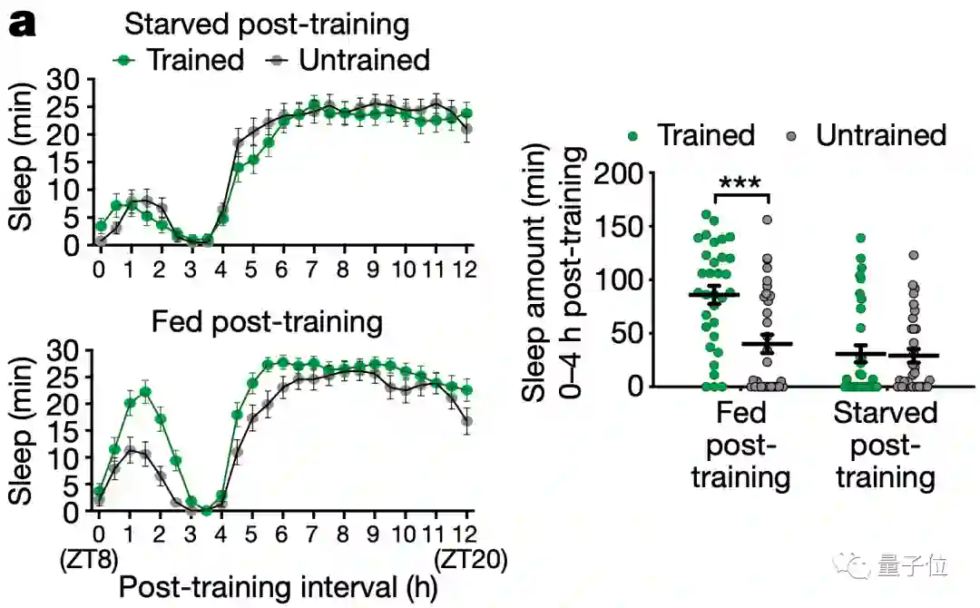 但果蝇在吃饱之后,受训比未受训所需要的睡眠时间明显变多。
