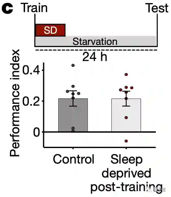 相比之下,饿着肚子的果蝇,无论睡不睡,都不会对记忆产生太大的影响。(反正都已经饿着肚子,睡眠就显得没有那么重要了?)
