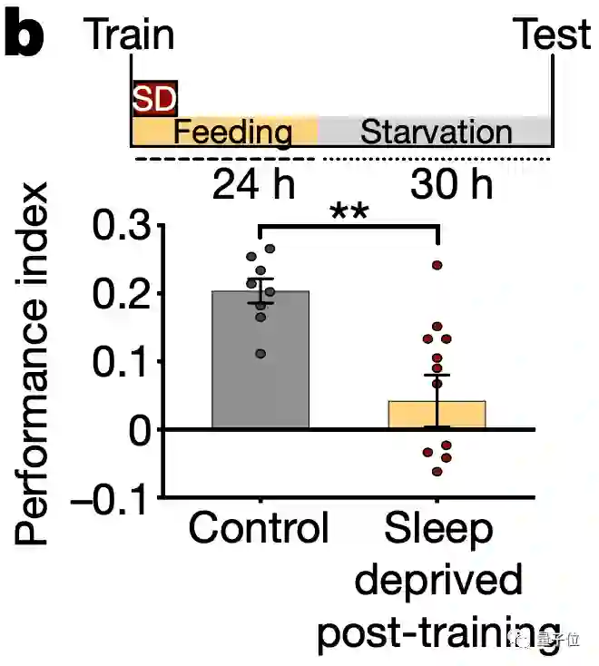 实验发现,果蝇在饥饿时,无论受不受训练(通过嗅觉反射训练,强制形成某种记忆),睡眠时间都没有明显变化。