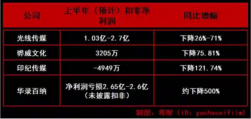 雪上加霜的是,很多影视公司的业绩也在今年出现的大幅下滑。2018年上半年,诸多传媒公司的业绩表现实在难称理想,包括华录百纳、骅威文化、印纪传媒、光线传媒在内的多家公司发布的业绩预告都显示,公司上半年的扣非净利润出现了明显跌幅甚至是亏损。下游院线方面,包括万达、上海联和在内的头部院线,场均观影人次再度有所下滑,影院生存压力同样与日俱增。