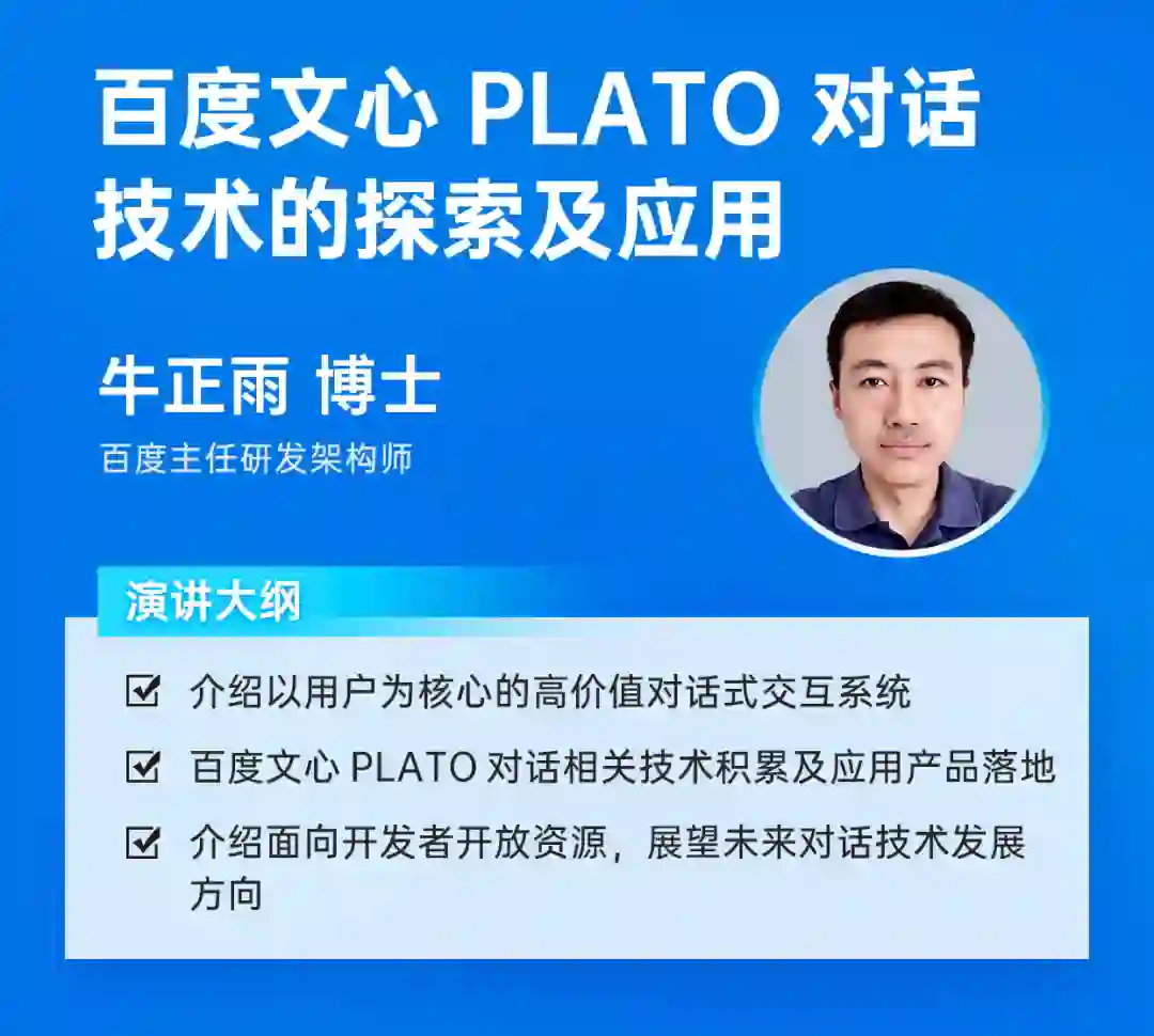 演讲嘉宾履历简介:牛正雨博士,现任百度自然语言处理部主任架构师,负责通用对话方向(北京团队)的技术研发与应用。曾参与百度知识图谱构建、搜索 query 分析等项目,至今已发表学术论文四十余篇,作为项目成员曾获得 2017 年度中国电子学会科技进步一等奖。
