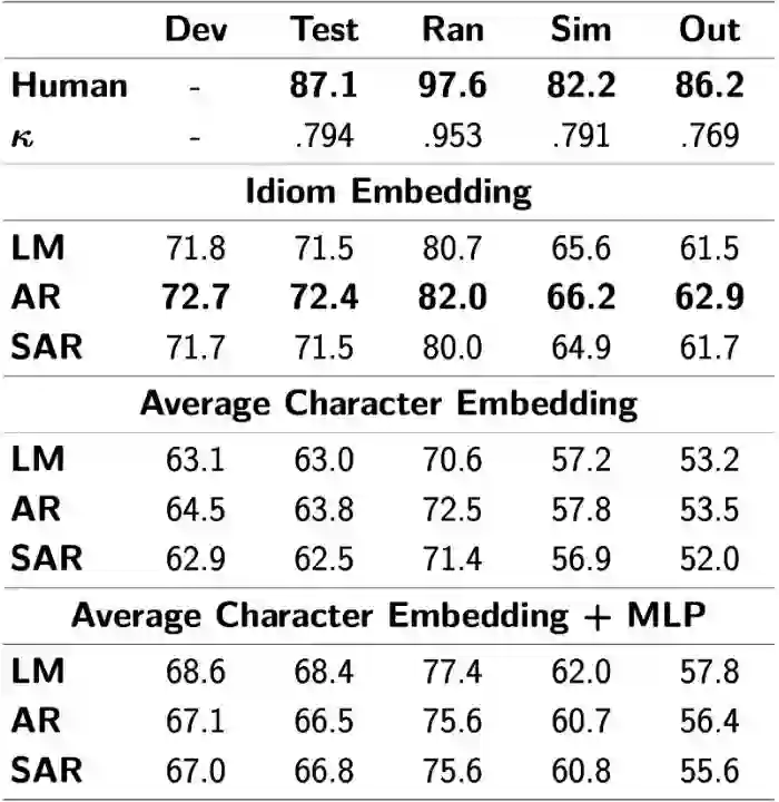 2. 人工实验的结果远好于模型,并且人类具有更强的泛化能力。人与模型最小的分数差是在测试集上(14.6),而最大的分数差是在域外集上(23.3)。同时,人在测试集与域外集上的分数很接近(87.1 和 86.2),但模型却有很大的差异(72.4 和 62.9),这表明模型并不能很好地泛化到包含更多低频成语的域外集上;