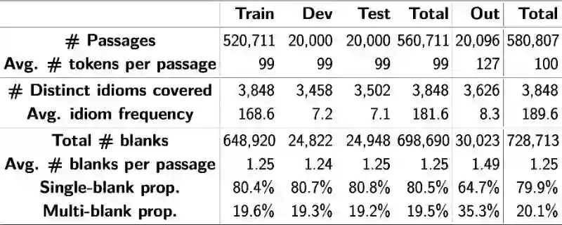 为了让数据集覆盖多种类型的文体和领域,我们从网上搜集了散文、小说的语料,从清华大学自然语言处理实验室开源的中文文本分类数据集 THUCNews [2] 搜集了新闻语料。基于原始语料,我们以段落为单位,将文本中的成语替换为空格,通过合并短段落、忽略长段落来保证段落长度在合适的范围内。最终,我们共得到 580,807 条数据,共有 728,713 个空格。