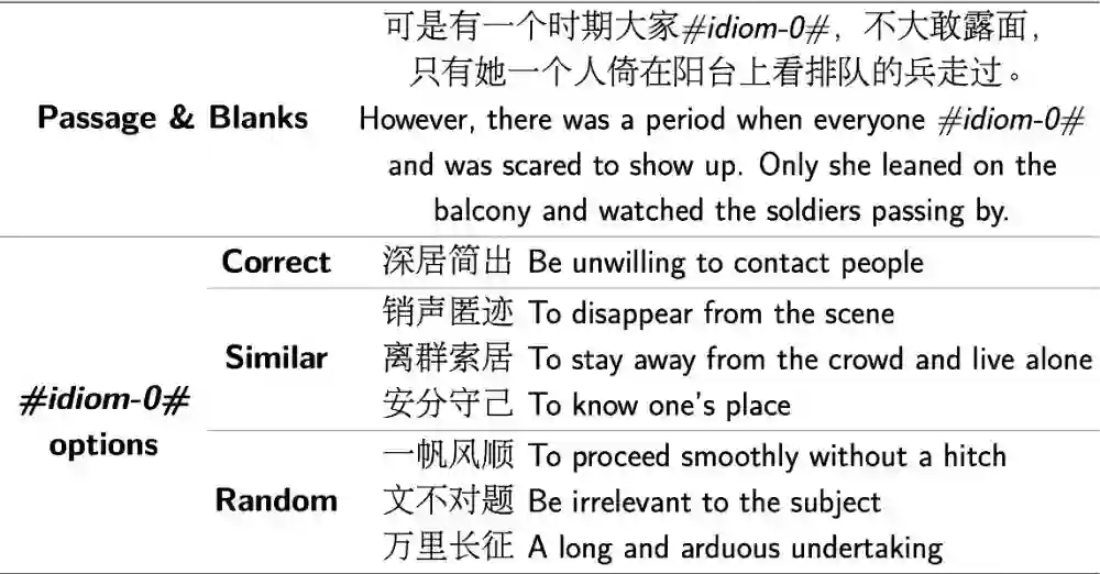 2. 据我们所知,这是首个将成语这一汉语中独特的语言现象融入机器阅读理解中的工作,为研究成语的使用场景、理解成语提供了高质量语料,也能够帮助成语学习者(包括青少年的本土学习者与汉语的第二语言学习者等)理解成语使用的方法、检测学习效果。
