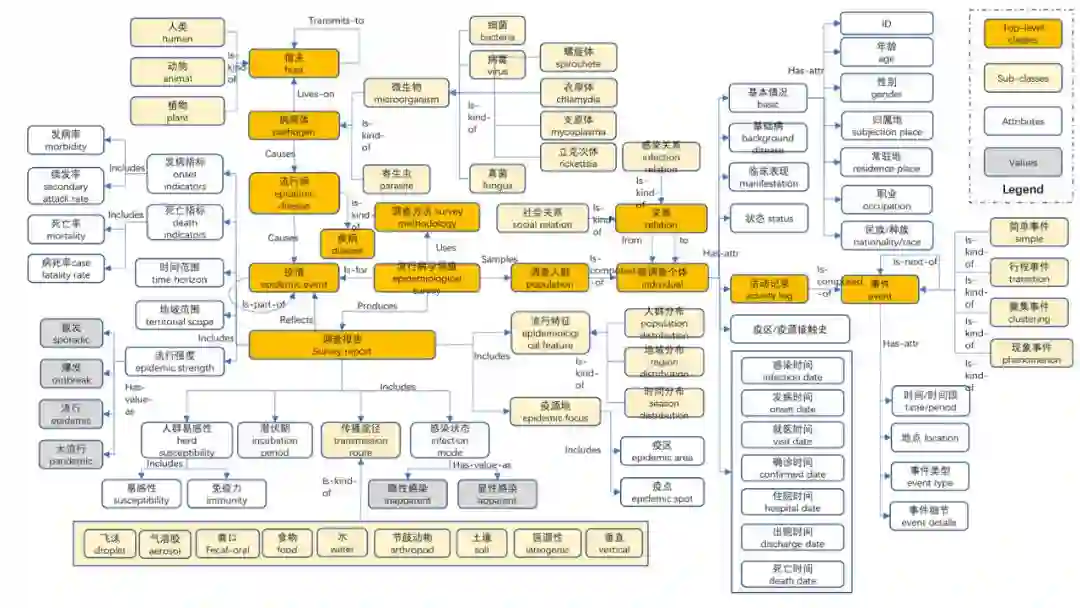 虚线中的关系和概念是未来工作中会添加的关系和连接的实体类型。比如病毒的基因实体、蛋白质实体、宿主实体等等。