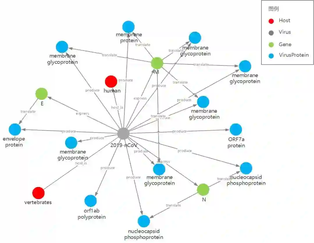 Translate表示基因与蛋白间的翻译关系,例如COVID-19的ORF8基因可翻译出ORF8 protein;另外,我们又用produce关系表示COVID-19可产生对应的蛋白。