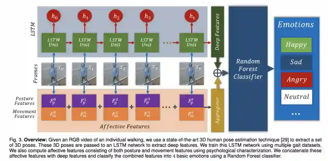 然后,他们从多个步行视频语料库中提取步态来识别情感特征,并使用三维姿态估计技术提取姿态。