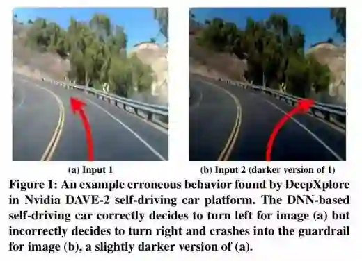 (图 1:DeepXplore在 Nvidia DAVE-2自动驾驶平台上找到的一个错误行为案例。基于 DNN的自动驾驶的车辆在图 (a)的场景中正确地决定向左转,但是在 (b)背景稍暗的场景中却错误地决定右转撞到防护栏上。)