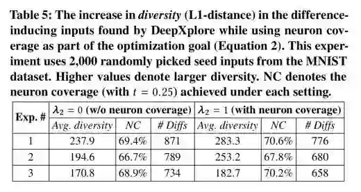 下表(Table 5)突出了将神经元覆盖纳入目标函数作为一种增加输入多样性的方式的重要性: