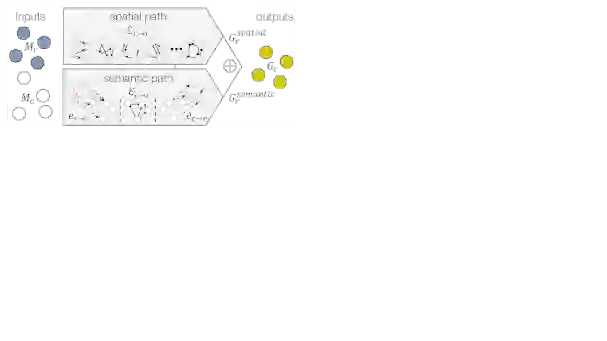 图4:在我们的全局推理模块r中使用的两个推理路径。以区域和类输入Mr和Mc为例,空间路径直接传递具有区域到区域边缘 Er→r 的区域图中的信息,而语义路径首先将区域分配给具有 Er→c 的类,然后将信息传递给具有类到类边缘Ec→c 的其他类,然后传播回来。组合最终输出以生成输出区域特征 Gr