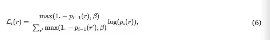 由于我们希望推理模块更多地关注较难的示例,因此我们建议根据以前迭代的预测,简单地对损失中的示例进行重新加权。具体的,对于迭代I≥1时的区域r,两个模块的交叉熵损失计算为: