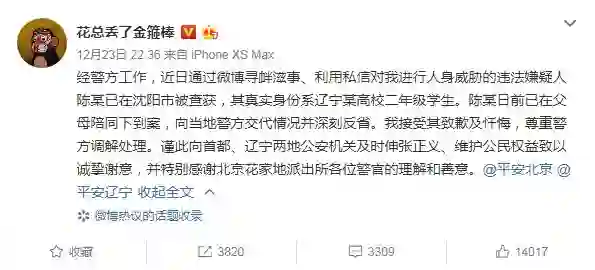 12月23日晚,博主“花总丢了金箍棒”称之前给他发死亡威胁人被找到了。经过北京、辽宁两地警方联合办案,确定该人是辽宁省沈阳市某高校大二的学生,近日,这名学生在其父母的陪同下到公安机关承认错误。