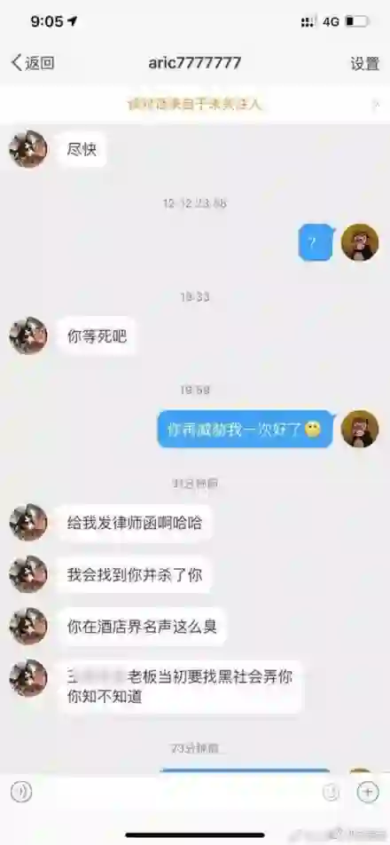 视频爆发后引发全行业关注,而曝光者花总也一时站在风口浪尖,当时就有网友推测,如此曝光过后指不定要遭受打击报复。果不其然,12月15日,“花总”在其微博发文称遭死亡威胁,并公布了聊天截图,显示有人向他私信称,“找到你杀了你”。随后,北京警方官方微博“平安北京”在其微博下评论:如果遇到网络威胁,可向所在地公安机关报警,同时也可以向平台举报该用户。