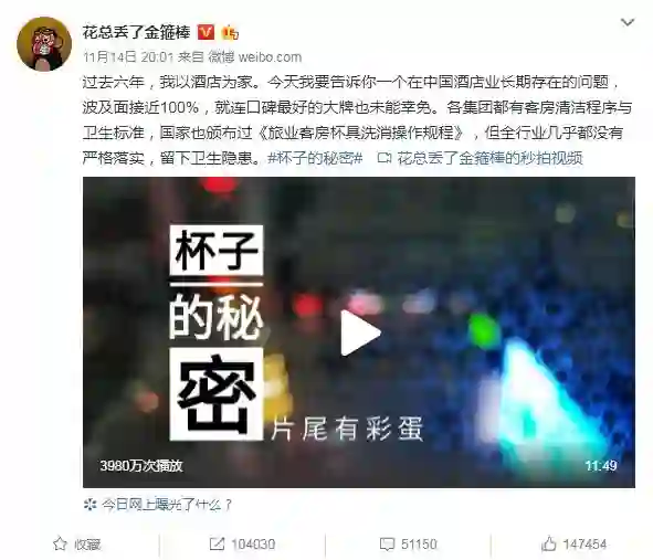 此前,我们曾报道过网友@花总丢了金箍棒 于11月14日在微博曝光国内多家五星级酒店存在清洁卫生问题,视频显示,酒店清洁人员直接用使用过的浴巾擦完马桶再擦水杯。