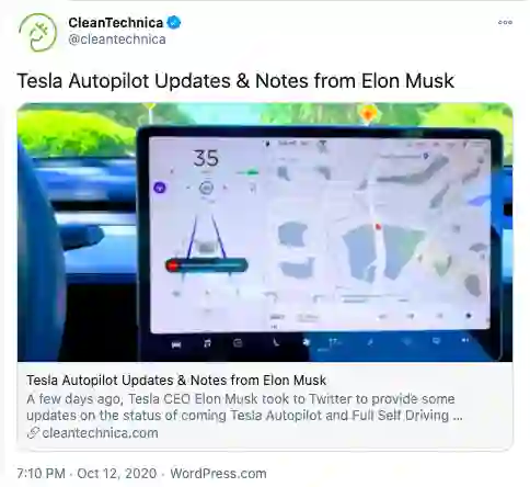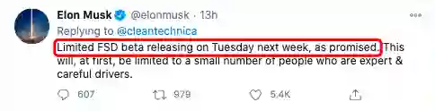 10月12日,知名科技媒体 CleanTechnica 在Twitter上发布了一篇名为《Tesla Autopilot Updates & Notes from Elon Musk》(特斯拉自动驾驶系统更新和埃隆·马斯克的注释)的文章,特斯拉CEO马斯克在该推文的回复中表示下周二起向部分车主推送全自动驾驶Beta版。