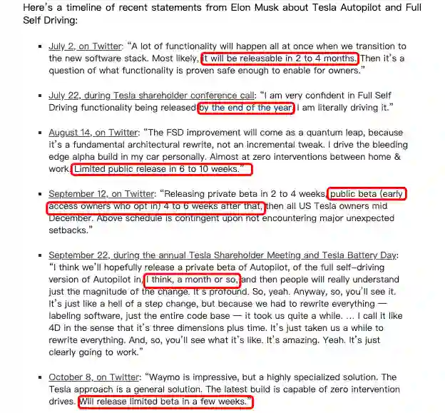 关于全自动驾驶车,马斯克的Twitter「时间表」