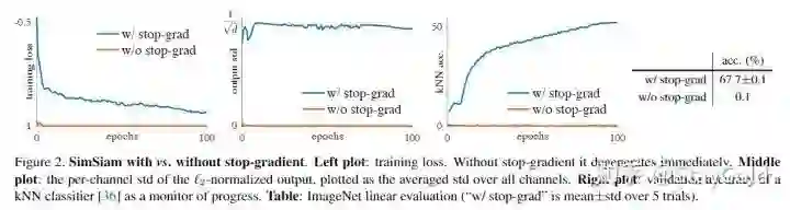 第二张图显示了输出表示的方差,如果没有stop-grad,方差近乎为0(发生了坍缩);而使用stop-grad能让方差为 ,差不多就是表示均匀分散在