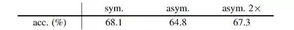 这里通过消融分析,说明了使用对称还是不对称的损失函数(3或4式)并不影响模型的收敛情况。作者倾向于认为对称的版本加强了数据,因此做了一个非对称(2x)的实验,发现能在1x的基础上进一步提升。