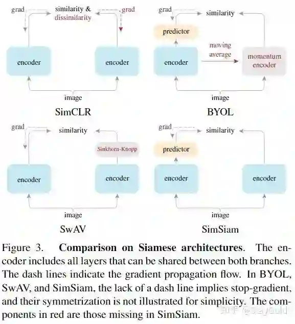 近一年出现了许多无监督、自监督图像表示学习的工作(MoCo、SimCLR、SwAV、BYOL等)。尽管它们的出发点、创新点各有不同,但大部分模型都遵从孪生网络的框架。即通过一个共享的编码器网络对同一个图像的不同增强版本(两个或多个)编码,使得它们具有较高的相似度。孪生网络是比较实体之间相似度的一个非常自然的工具。
