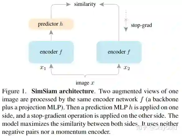 本文证明了即使没有上面三个策略,简单的孪生网络(称为SimSiam)也能达到类似的效果,只需要一个stop-gradient的操作。