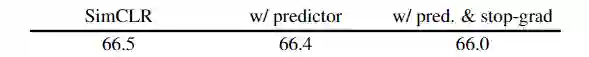 SimSiam可以视为是SimCLR去掉负样本。为了进一步对比,作者对SimCLR加上了predictor和stop-grad结构,效果没有提升: