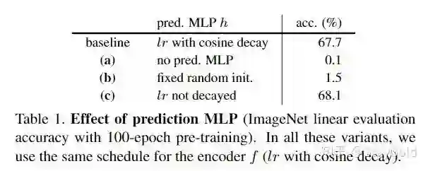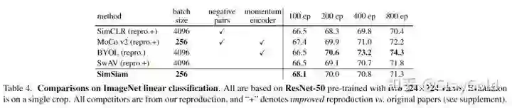 上图验证了BN的效果,实验证明在projection(ResNet内)网络中的隐层和输出层,在predictor网络中的隐层加BN效果最好。
